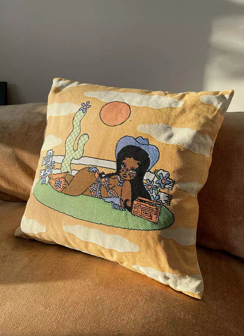 This colorful woven pillow features original Valfré artwork. It comes stuffed, and is the perfect statement piece to spice up your home.Â