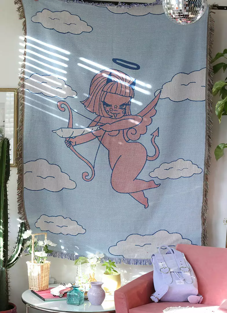 This large woven blanket features original Valfré artwork. Drape it across your bed/couch, hang it in your living space, or bring it to the beach.Â