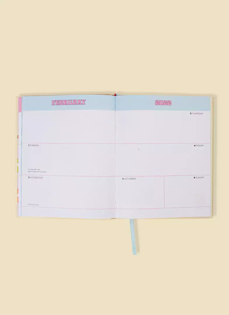 This hard cover, colorful planner includes original artwork by Valfré for each month of the year, 5 pages of stickers, a monthly calendar, a weekly calendar, pages for notes, and witty artwork for key dates throughout.