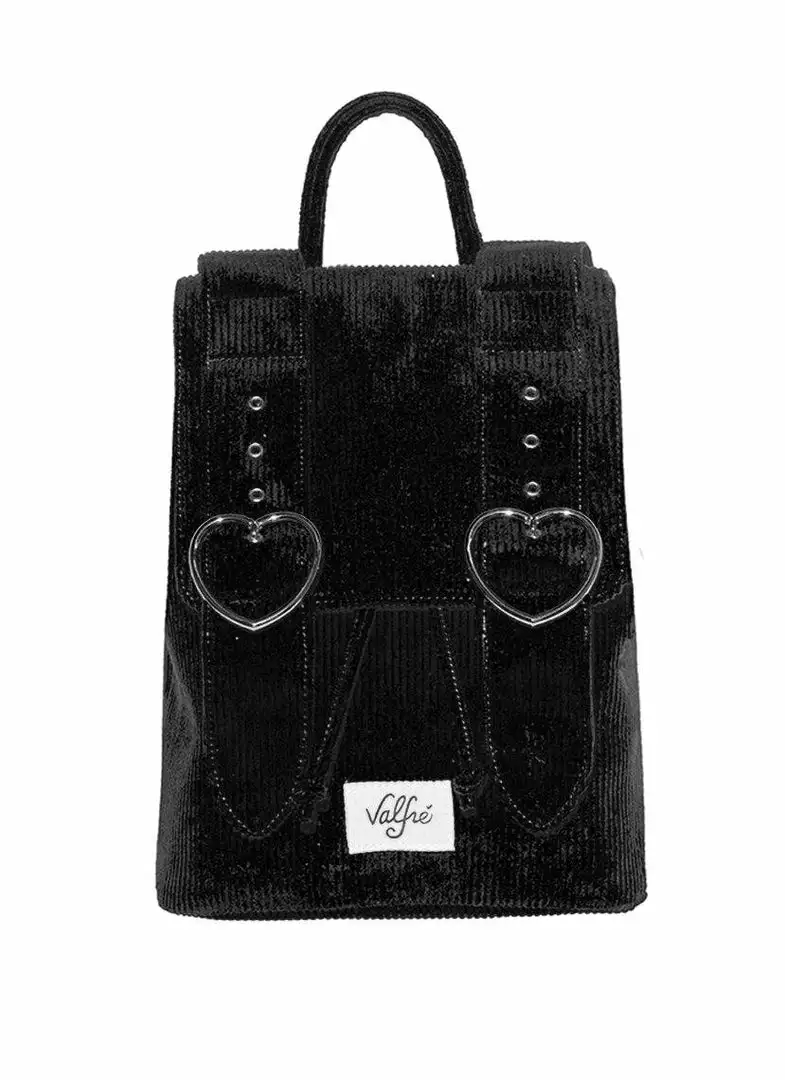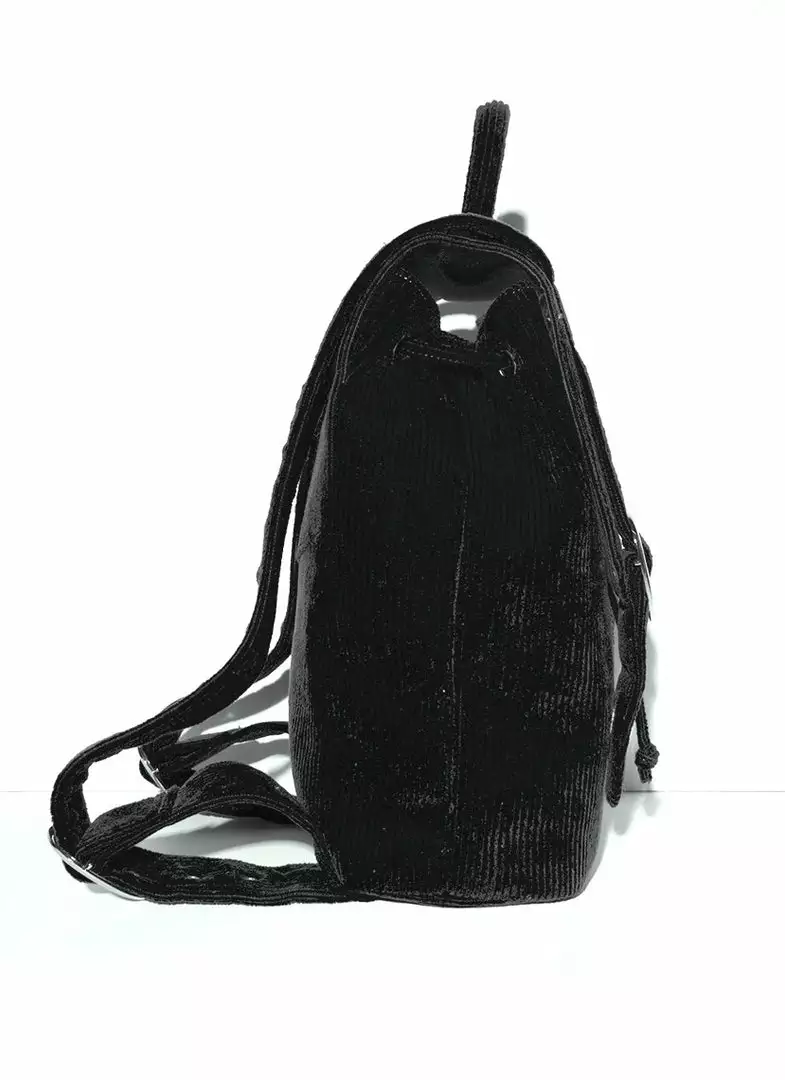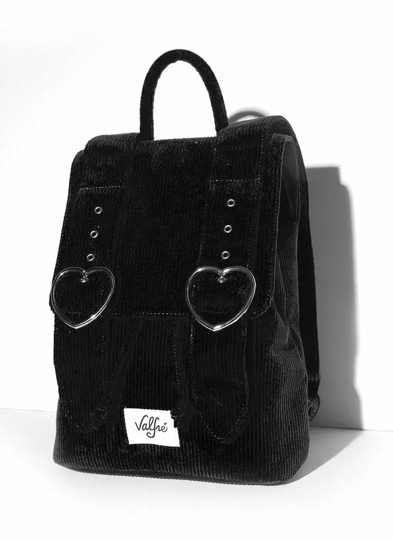 This black corduroy backpack features heart buckles, magnetic closures, adjustable straps, a drawstring, canvas lined interior, and zipper pouch inside.