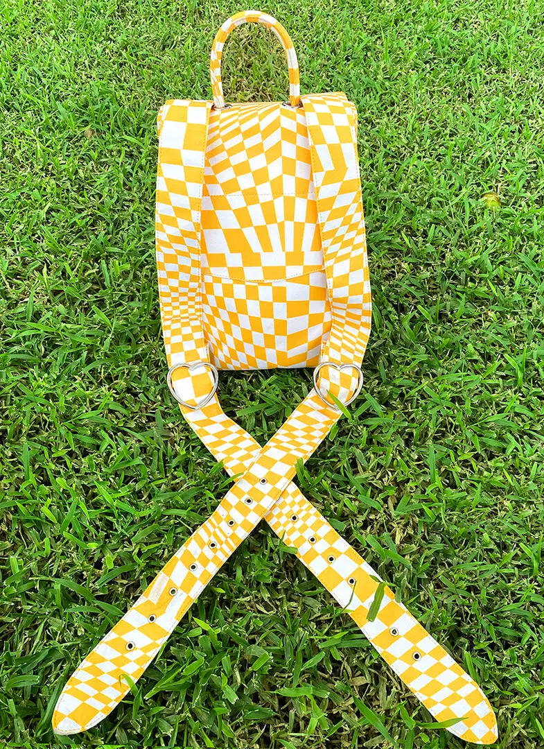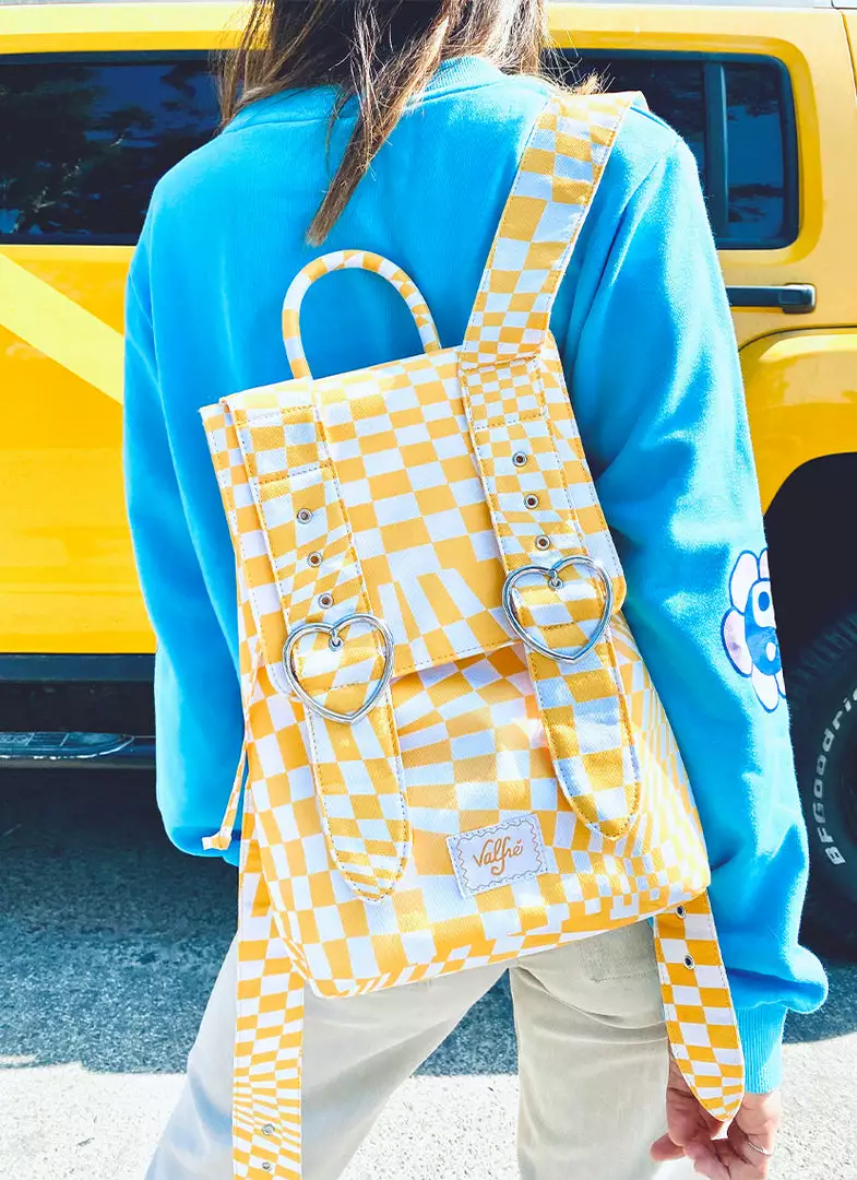 This yellow checkered backpack features heart buckles, magnetic closures, adjustable straps, a drawstring, canvas lined interior, and zipper pouch inside.