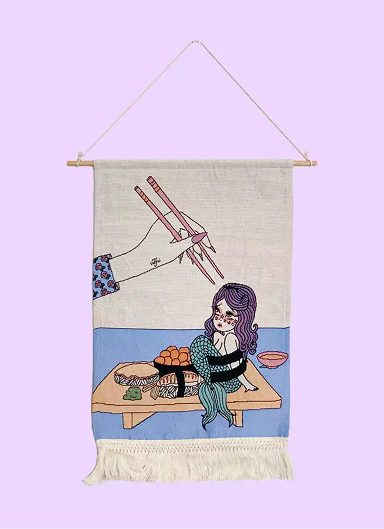 This woven tapestry features original Valfré artwork, a wooden rod to easily hang, and fringe at the bottom.Â