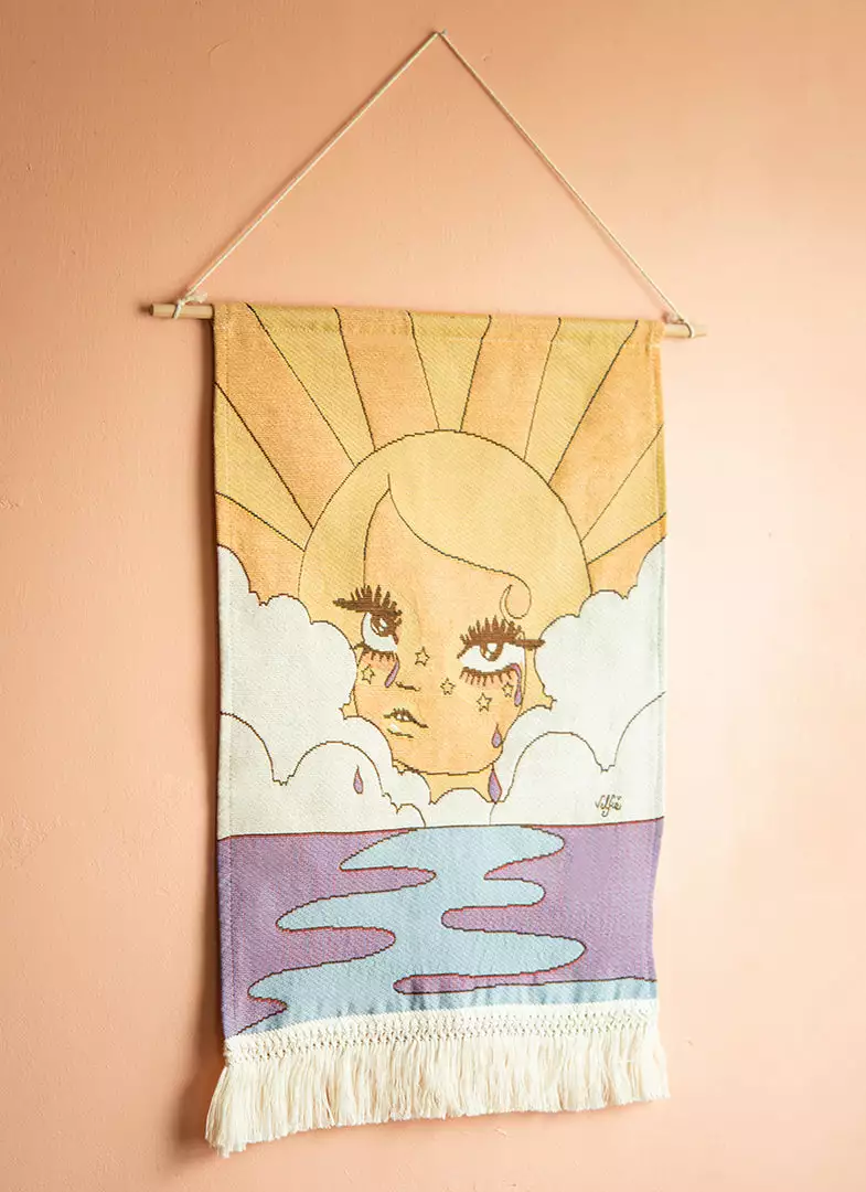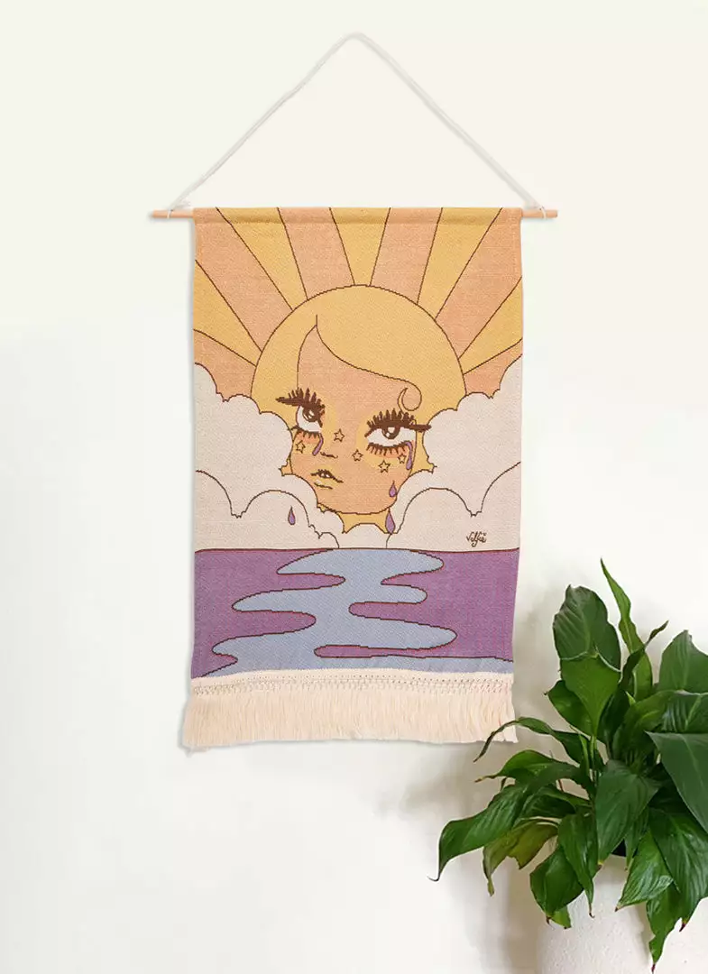 This woven tapestry features original Valfré artwork, a wooden rod to easily hang, and fringe at the bottom.Â